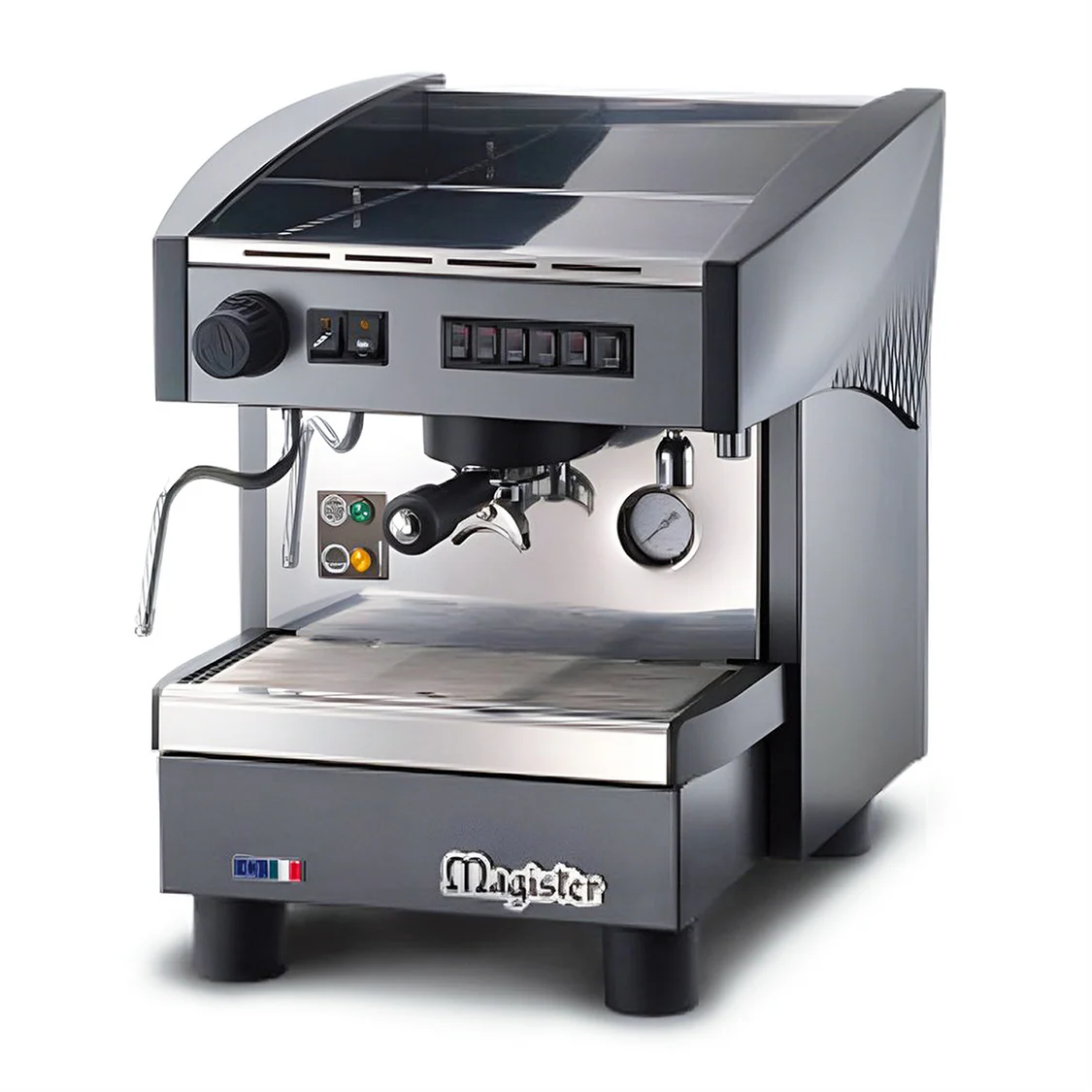 Cafetera automática electrónica compacta de 1 grupo, línea Stilo, marca Magister. Diseñada para uso profesional con dosaje programable, ideal para cafeterías que requieren precisión, consistencia y control total en cada extracción.