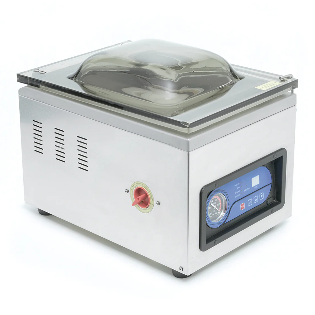 Empacadora al vacío de cámara diseñada para negocios que requieren sellado profesional y conservación prolongada. Fabricada en acero inoxidable y equipada con una barra selladora más amplia para mayor versatilidad en el envasado.