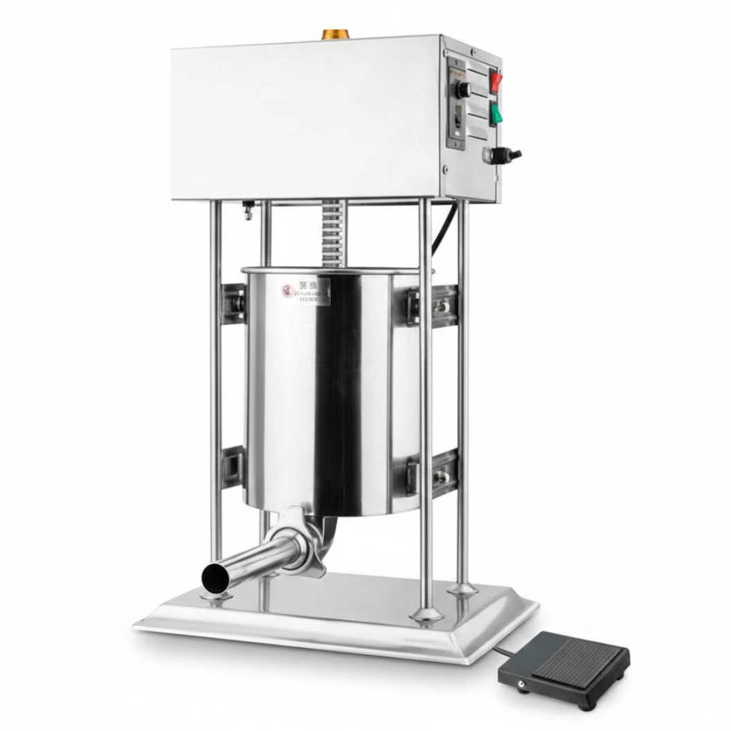 Embutidora eléctrica vertical de uso profesional, diseñada para carnicerías, cocinas industriales y productores artesanales que requieren mayor productividad, precisión y operación continua con mínimo esfuerzo.