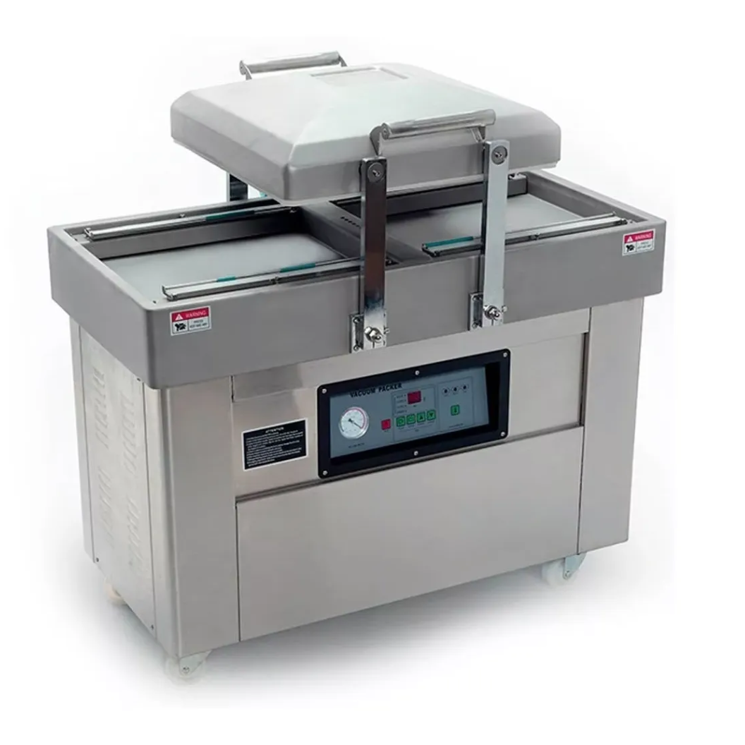Empacadora industrial de doble campana diseñada para maximizar la producción, permitiendo sellar mientras la otra cámara está en ciclo, ideal para líneas de trabajo de alto rendimiento.