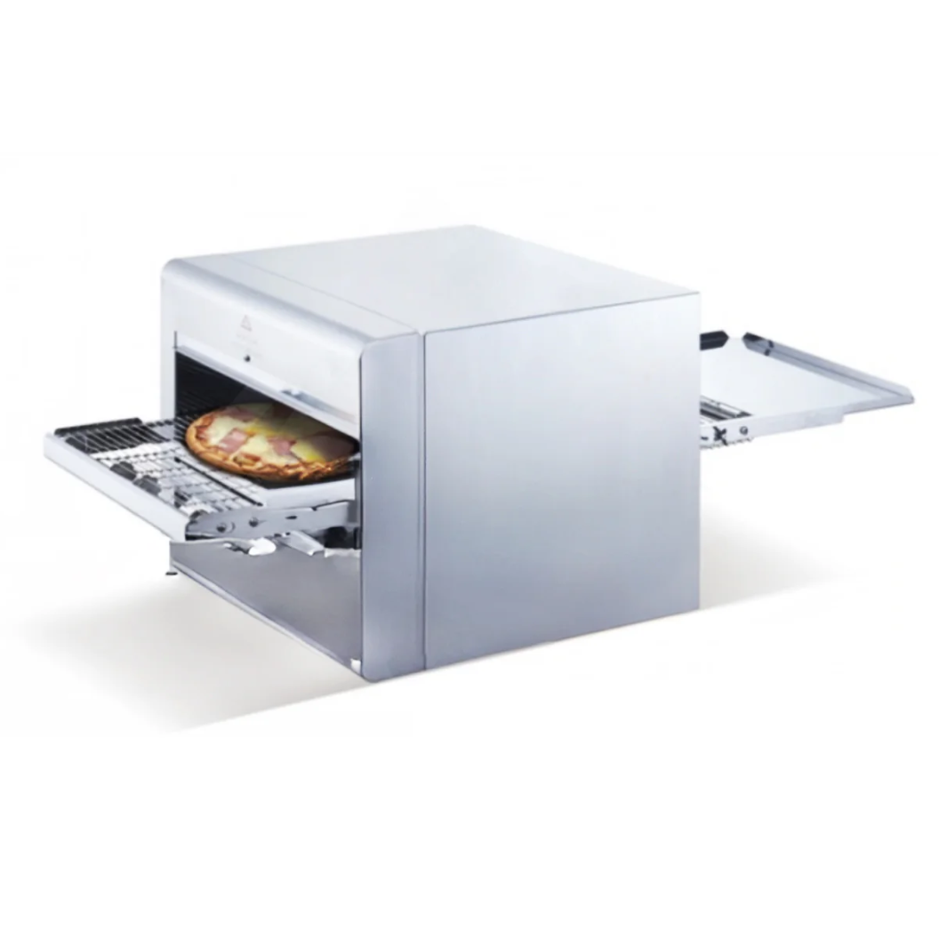Horno eléctrico transportador compacto ideal para pizzas de 12”, molletes y horneado rápido, ofreciendo cocción uniforme, controles programables y diseño apilable para aumentar la producción.