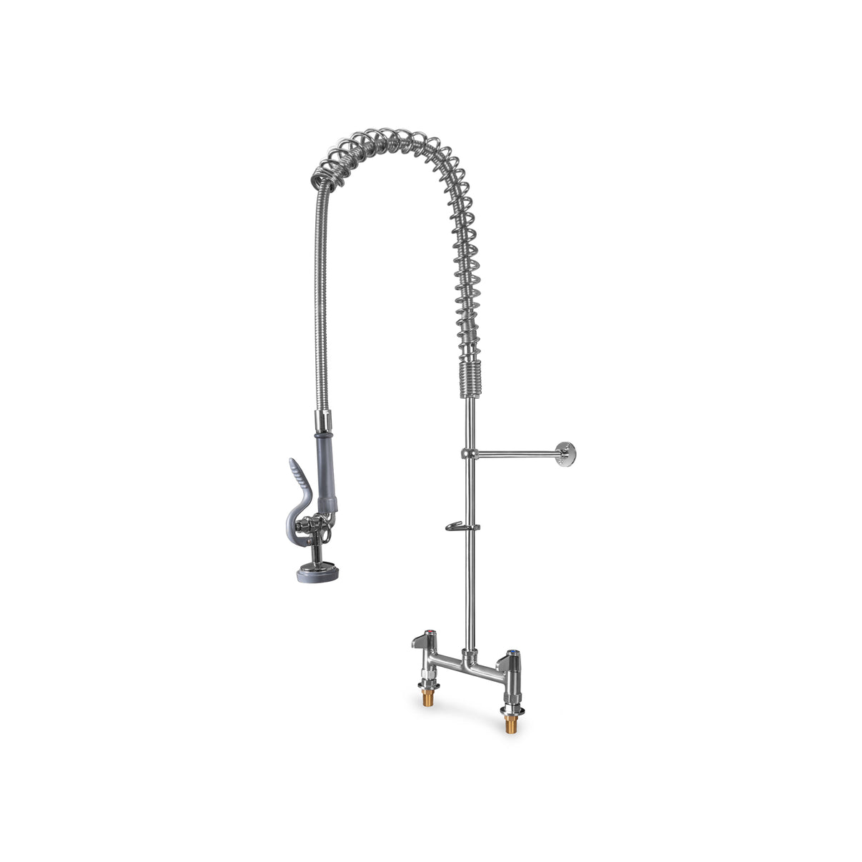 Manguera de prelavado profesional diseñada para cocinas industriales y áreas de lavado que requieren alta presión y control de temperatura. Su manguera flexible de acero inoxidable, regadera rociadora de alto desempeño y llaves separadas para agua fría y caliente permiten una limpieza rápida, eficiente y segura, incluso en jornadas intensivas.