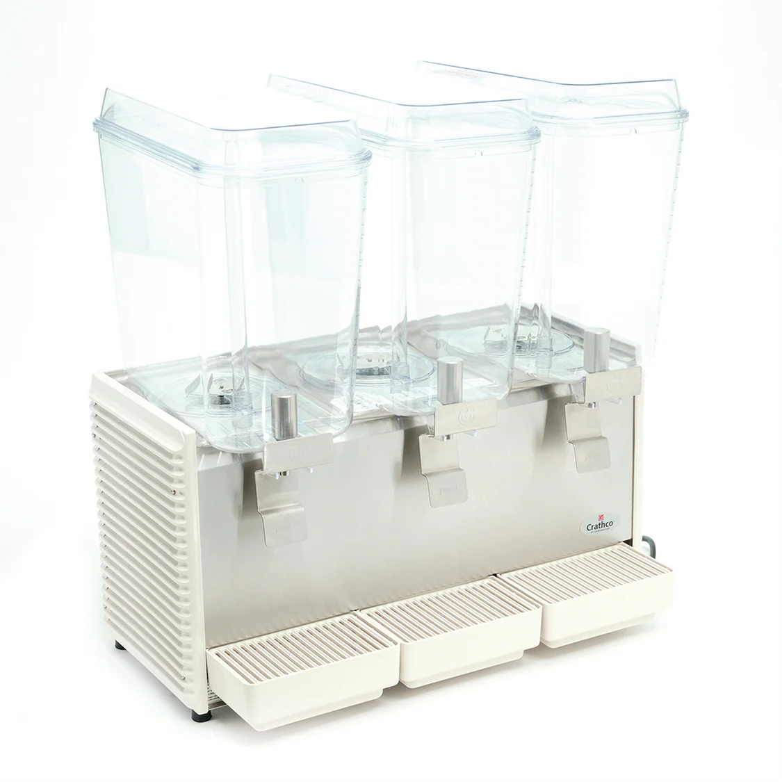 Dispensador de bebidas de tres tazones, marca Crathco, diseñado para el servicio profesional de bebidas frías en establecimientos comerciales. Permite ofrecer múltiples bebidas de manera simultánea, con operación continua, segura y eficiente, incluso con líquidos que contienen pulpa.